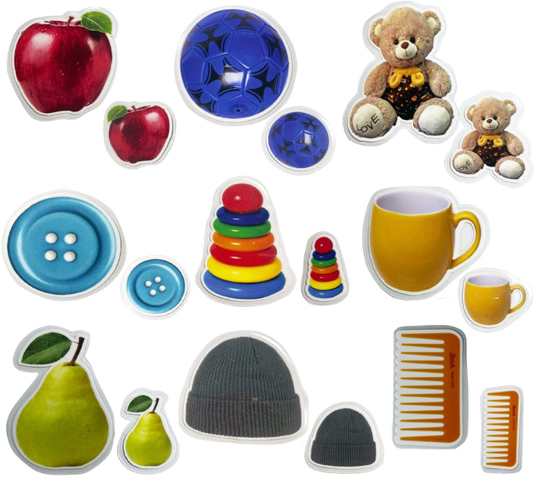 Набір складається з 9 пар зображень (усього 18 карток), надрукованих на щільному папері, вирізаних і заламінованих для довговічності. У кожній парі є велика (приблизно 10×10 см) і маленька (приблизно 6×6 см) картинка одного і того ж предмета.